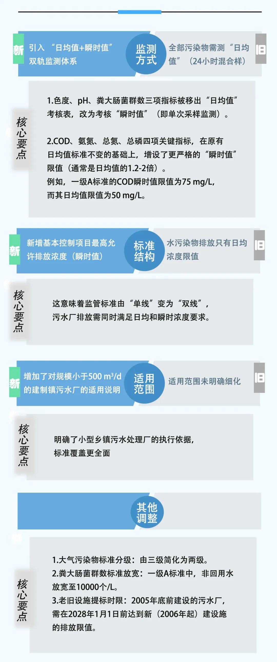 新标准思路:区分污染物特性。对于色度、pH、粪大肠菌群等一旦瞬时超标就会立即影响环境的指标,改为考核瞬时值;对于COD、氮、磷等需累积到一定总量才产生影响的指标,则保留日均值,并增设瞬时值上限以防止短期冲击。
